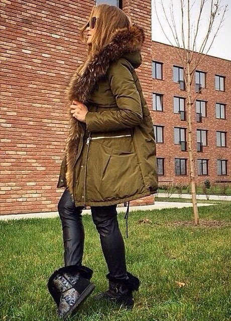 Поистине роскошно и шикарно выглядит пуховик цвета хаки с мехом.