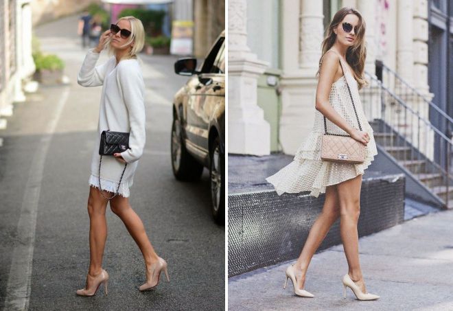 Великолепным выбором являются серебристые туфли-лодочки. Они гармонично смотрятся с облегающими платьями, а также с моделями А-образного силуэта. С туфлями на высоком каблуке можно носить платья разной длины, начиная мини и заканчивая макси.