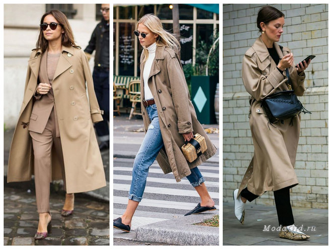 Этот тренд несомненно заслуживает внимания, так как классический бежевый плащ снова на пике моды. Универсальный цвет подойдет к любому образу. Чтобы вещь не казалась старомодной и скучной, дизайнеры рекомендуют использовать их согласно новых веяниям моды, не бояться разных видов сочетаний и экспериментов с длиной. Для любителей классики идеально подойдут макинтоши, а тем, кто хочет выглядеть кокетливо и свежо можно приобрести тренчи с длиной мини.