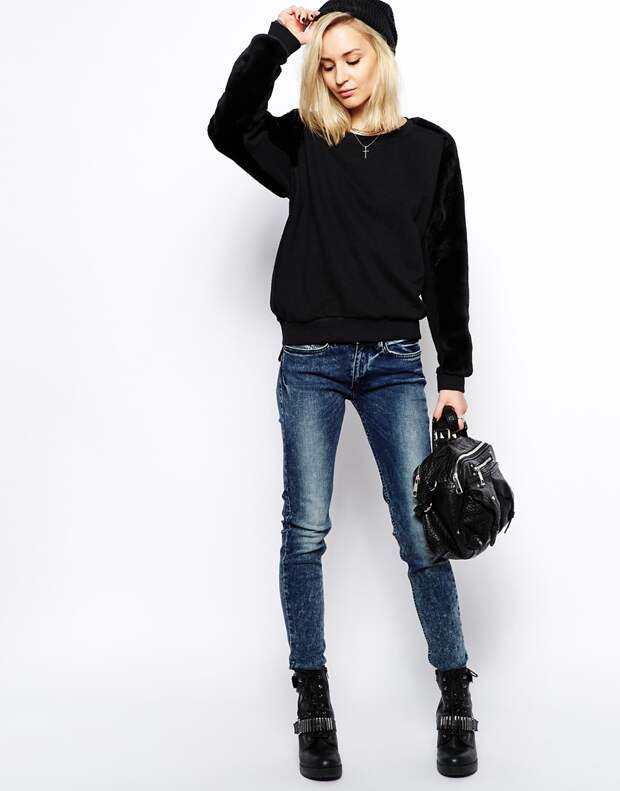 - С джинсами. Создавшийся образ зависит от фасона брюк. Каким бы не был sweatshirt – монохромным или разноцветным, с рисунком, логотипом или абстрактным узором – с разными джинсами он будет выглядеть по-новому.
