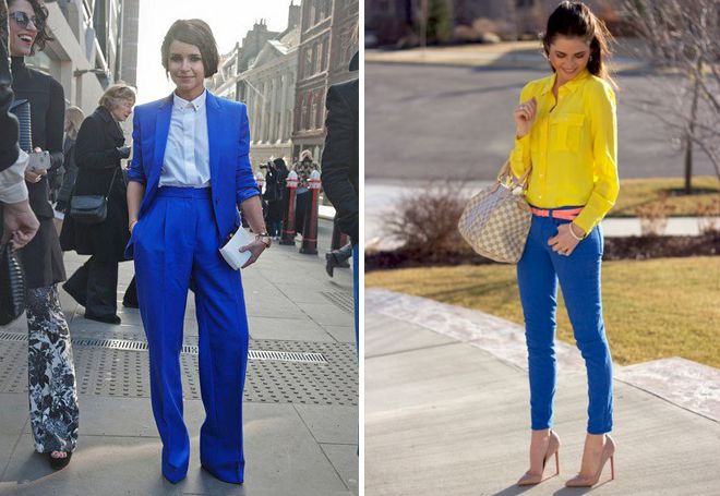 Очень ярким и смелым является сочетание синего и красного. Такой тандем хорошо подойдет и для делового и для неформального стиля. Если выбран классический костюм, к примеру, с красным топом, то очень стильно будет дополнить его красными туфлями или босоножками на шпильках.