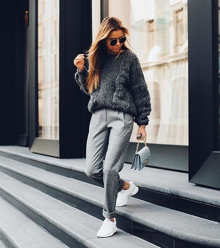 Сочетание серого с розовым можно назвать классическим. Такой образ был бы хорош с серой блузой и водолазкой, но со свитшотом он получается весьма неординарным и современным!