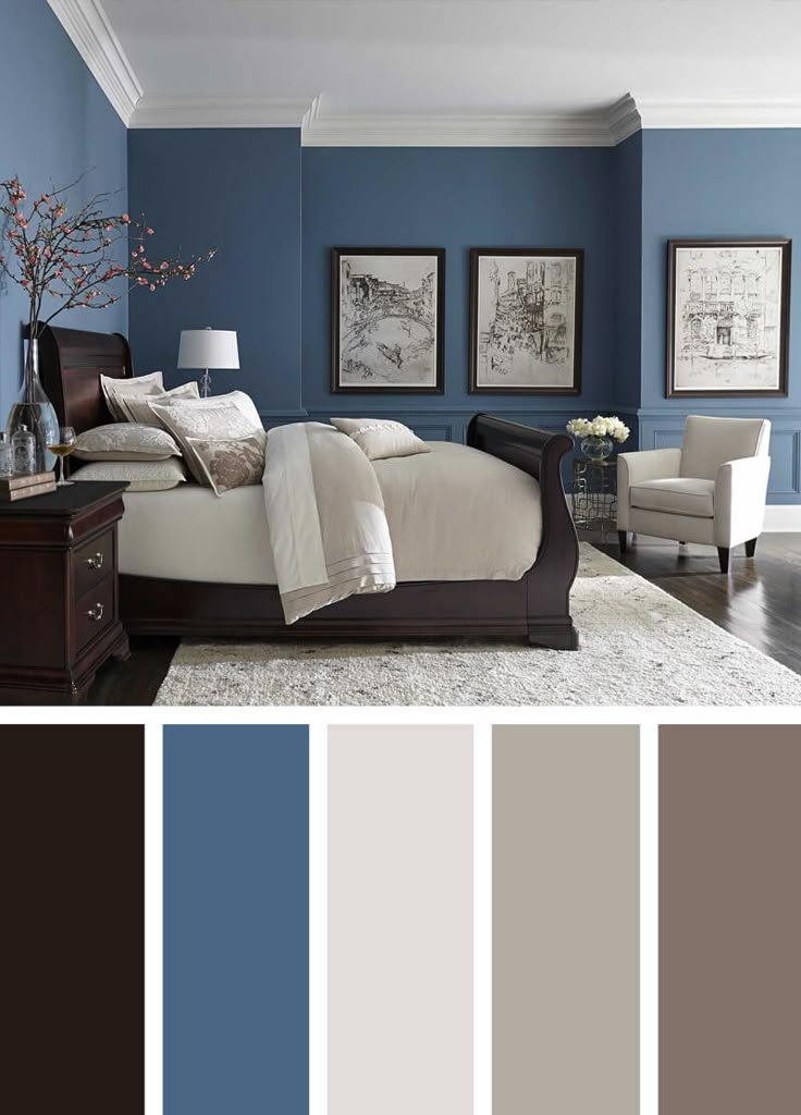 Одной из наших любимых является спальня со средней бежевой стеной и яркой темно-синей акцентной стеной. Бежевый и синий здесь так хорошо дополняют друг друга, потому что они являются традиционными, классическими оттенками, которые кажутся приземленными и нейтральными, но при этом живыми.