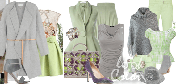 Сочетание светло-серого цвета с теплым зеленым. Его можно назвать ласковым, так как его глубокие природные корни дают основу: как камень и трава, деревья и дождевые тучи, город и парки. Теплые оттенки зелени значительно оживляют серый. Попробуйте для сочетания со светло-серым цветом применить такие оттенки, как фисташковый, салатовый, травяной, оливковый, болотный.