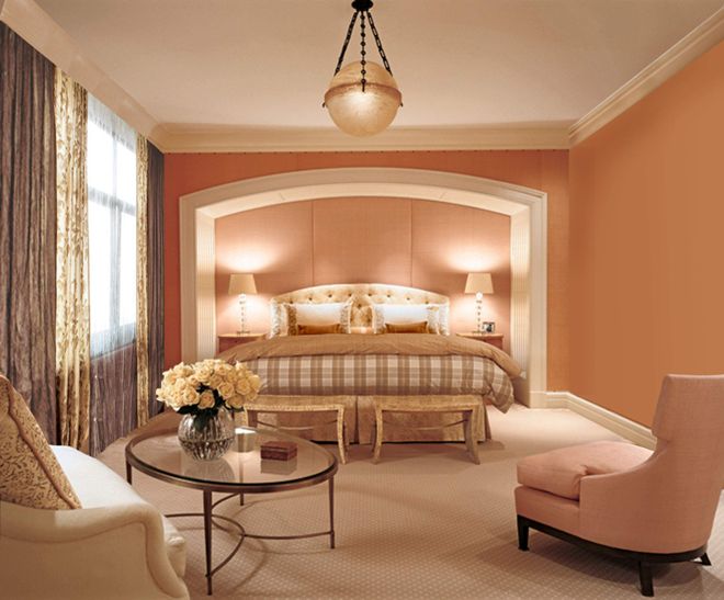 Мягкие варианты персикового цвета являются самыми подходящими для создания спокойной спальной комнаты. В зоне отдыха нежелательно использовать слишком яркие и кричащие оттенки, чтобы не мешать процессу расслабления нервной системы человека.