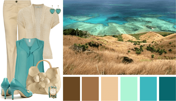 Бело — желтый, зеленый, оранжевый, коричневый, бежевый и другие теплые оттенки требуют от бирюзового более зеленого оттенка, чтобы гармонично сливаться с теплыми цветами. «Синеватая» бирюза может использоваться с другими насыщенными цветами в стилях поп – арт или других современных комбинациях, предполагающих «взрыв» устоявшихся традиций или в ванной комнате.