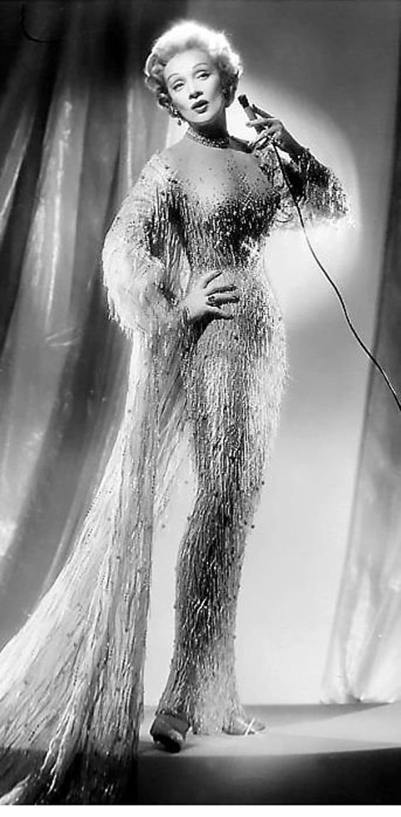 Пайетки всегда ассоциируются с вечеринкой, чем-то нарядным и торжественным. Дитрих смотрелась просто ослепительно в сверкающих платьях! В предновогодний период этот прием точно нужно взять на заметку.