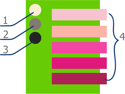 Фоновая плашка залита оттенком зеленого, с которым составлено сочетание. В верхнем левом углу вы можете видеть 3 нейтральных оттенка (залитых в круги) под № 1, 2, 3: (1) (верхний) — оттенок белого, который более подходит к этому цвету. (2) — оттенок серого или бежевого, который наиболее удачно оттеняет комбинацию. (3) — темный, нейтральный цвет, усиливающий контраст всей палитры.