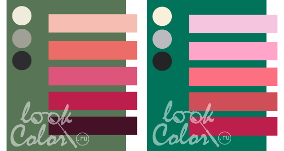 Зеленый роял сочетается с розовым: бело-розовым, гвоздикой, ультро-розовым, амарантовым, пурпурно-розовым. Нейтральная палитра: светло-кремовый, светло-серый, черно-серый.