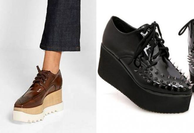 Первый вариант чаще всего становится выбором молодежи, ведь именно подростки любят выделяться из толпы и поражать своим бунтарством. Встречается невероятно оригинальные дизайны, не говоря уже о сдержанности и так называемой классике. Все зависит от цвета обуви, высоты подошвы и материала выполнения. Подошва может быть каучуковой, резиновой, полимерной и т.д. Чаще всего подошва выполняется контрастной основному цвету обуви. Сверху туфли могут быть как на шнуровке, так и на замочке, заклепках или ремешке.