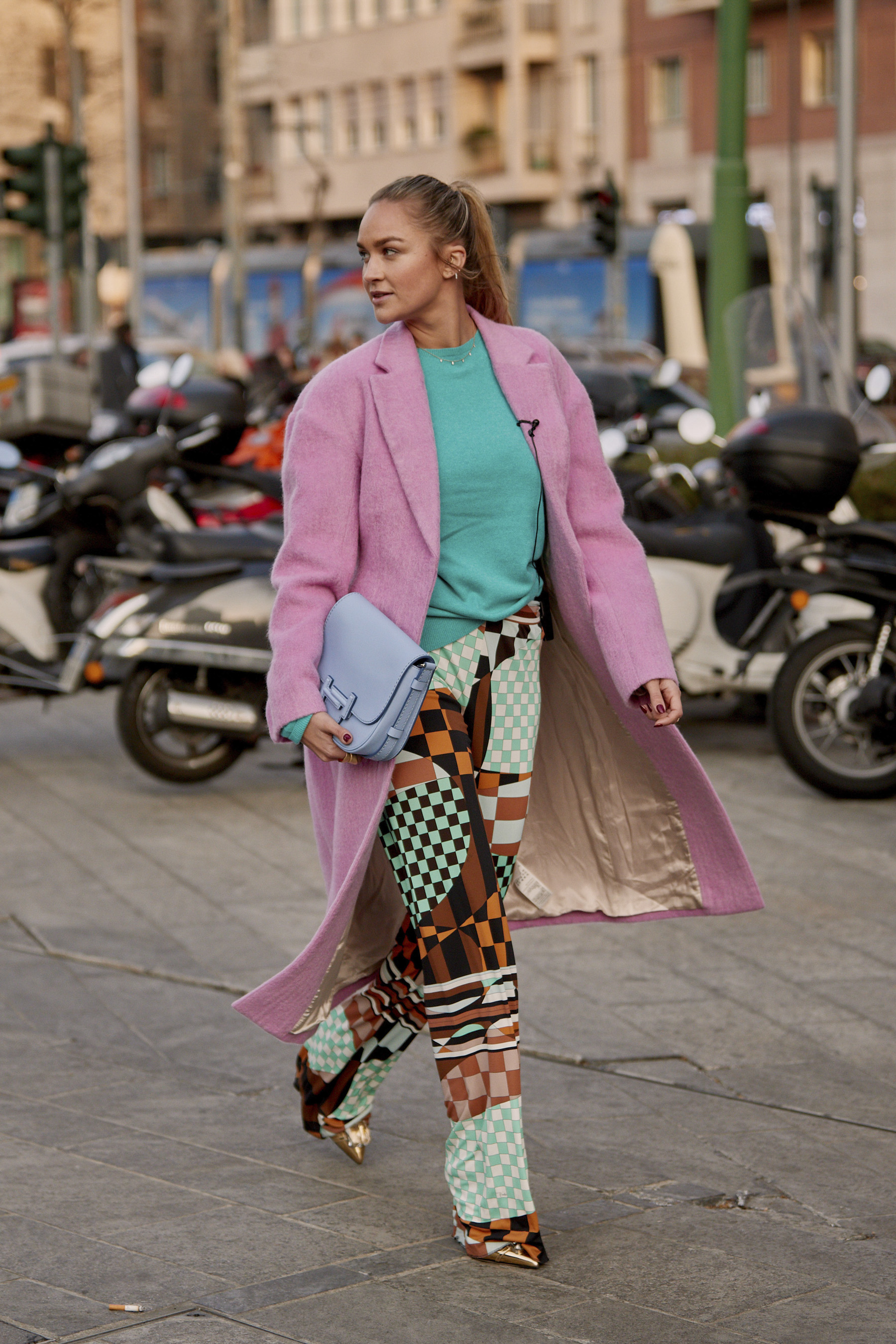 Самый популярный тренд Pinterest получил лечение Джиджи Хадид! Она соединила пудрово-синие брюки из бумажных пакетов с подходящим свитером с напуском и еще одной мини-сумкой.