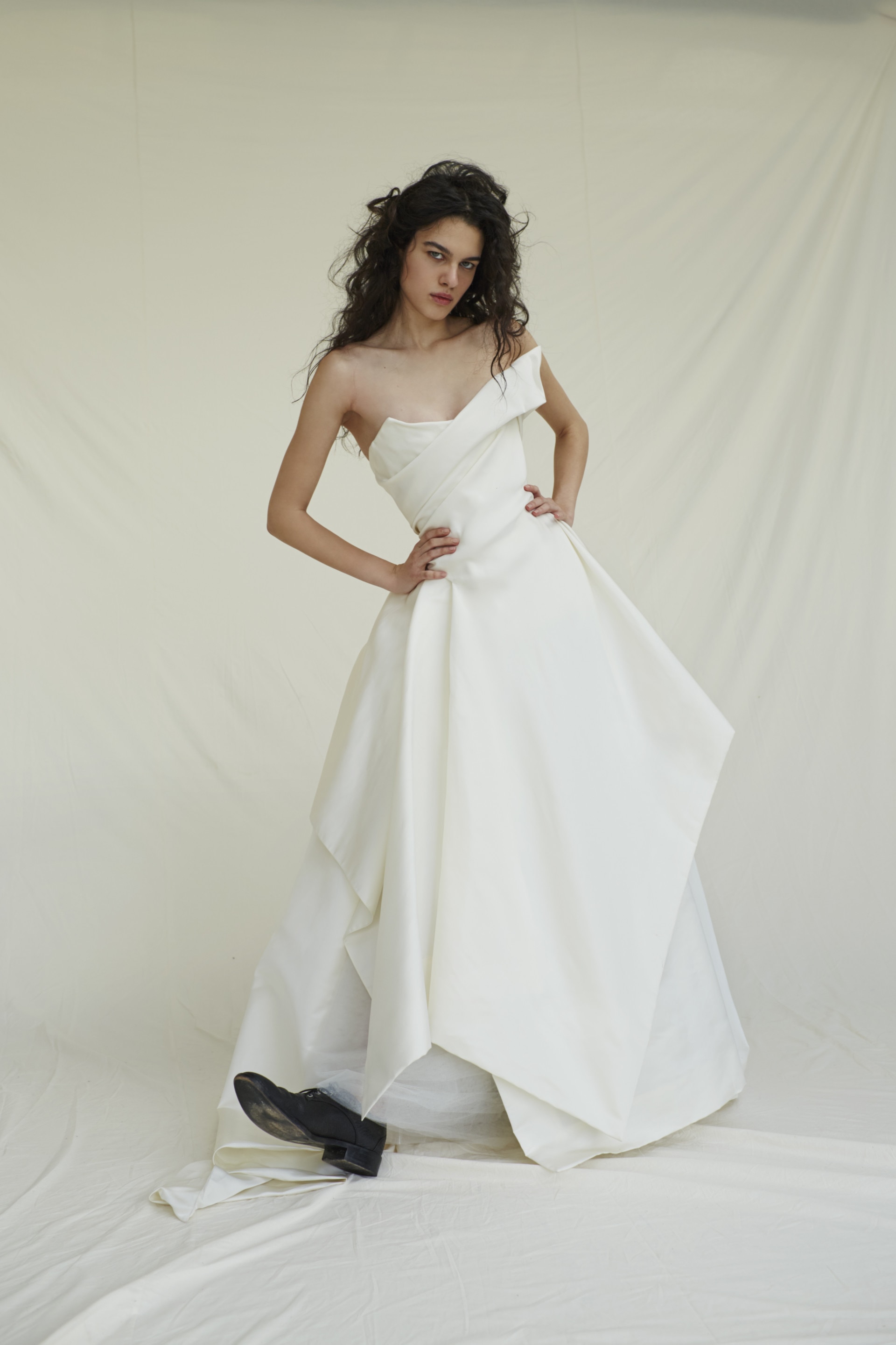 По словам ателье: « Платье Levant вдохновлено французским художником Матиссом и формами, созданными его знаменитыми вырезами. Эти выразительные формы были драпированы на корсете основы, чтобы создать игривое свадебное мини-платье. ”
