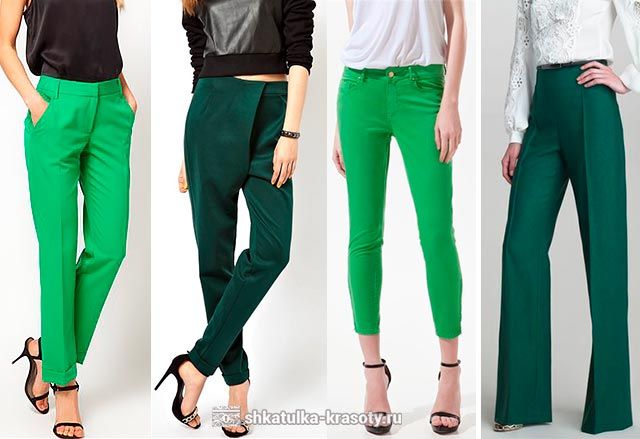 Зеленые штаны могут быть разнообразных оттенков, от светло-салатового до темно-болотного. Многие женщины любят мятный, малахитовый, изумрудный оттенки. Они все натуральные и отлично к ним подходят такие же натуральные коричневый, желтый, белый, бежевый и прочие.