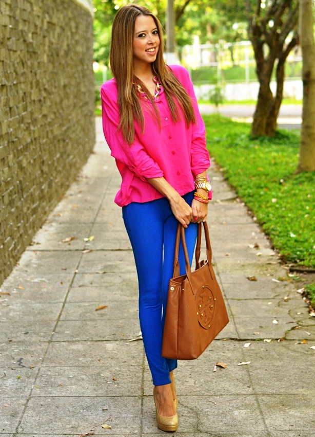 Голубой верх вполне гармонично соседствует с низом в теплых коричневых оттенках.