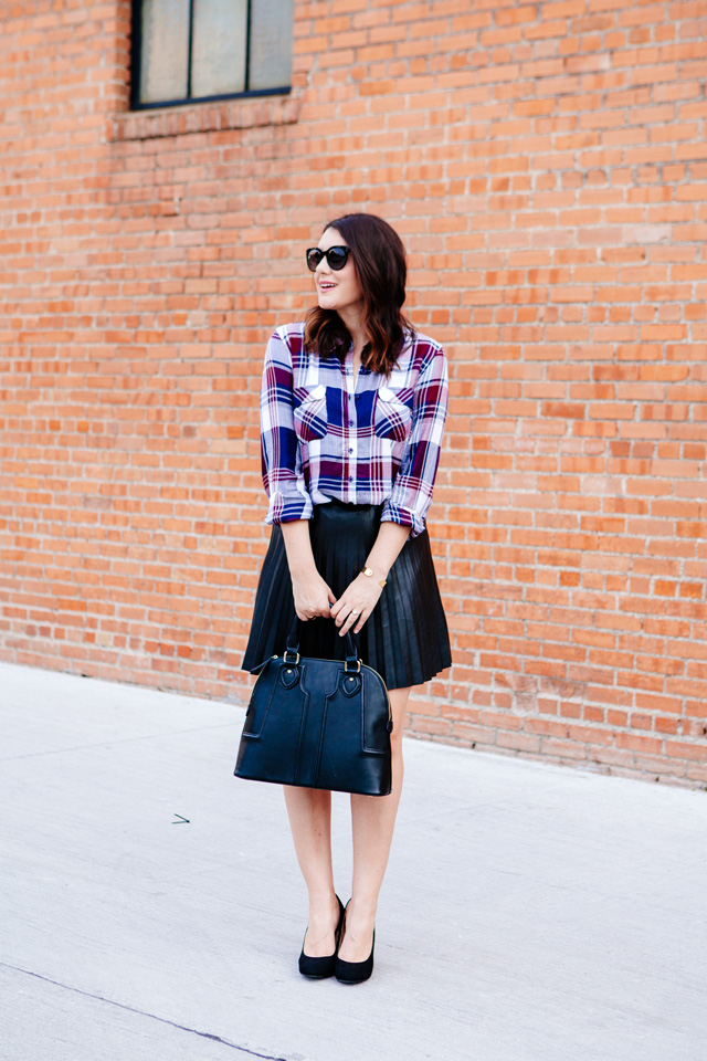 Гармоничный тандем на любой случай жизни получится из микса темно-синей юбки и терракотовой блузой. Сумка и обувь — на пару тонов светлее блузы.