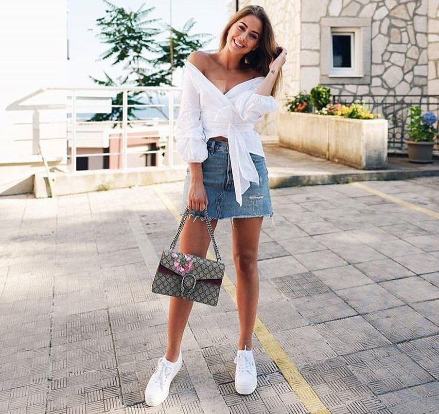 Образы с мини-юбкой и кроссовками | Наряды с джинсовой юбкой