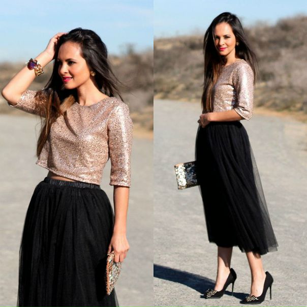 Вечерние юбки и блузки – это хорошая замена платью. Для этих целей хорошо выбрать нарядную блузу, украшенную кружевом, камнями, пайетками – в общем, что-то роскошное.