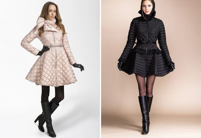 К пуховику следует подобрать теплое платье или юбку, которые можно сочетать с сапогами до колена.