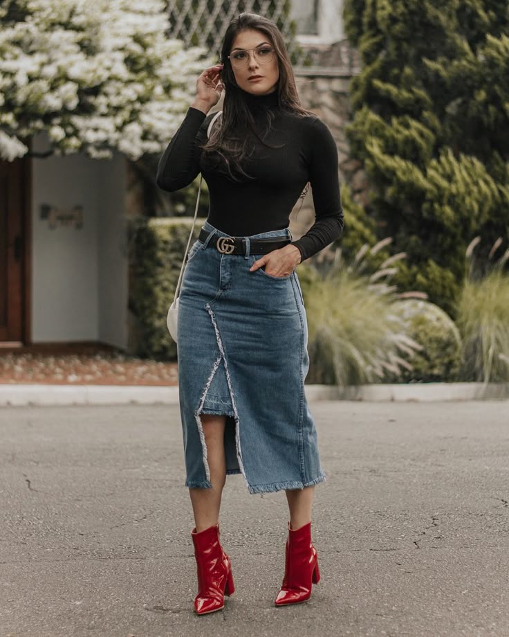 Красные юбки из денима встречаются в магазинах одежды крайне редко, поэтому, если вам захотелось обзавестись такой вещью, проще всего будет сшить ее самостоятельно или заказать в ателье.