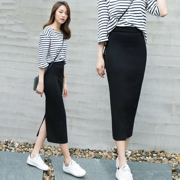 Юбка такого фасона и длины зрительно удлиняет фигуру, т.к. создает вертикаль. Главное — подобрать идеальную посадку по фигуре, иначе либо появится мешковатость, либо складки спереди. Если форма ваших колен не идеальна, выбирайте юбку, чуть прикрывающую их.