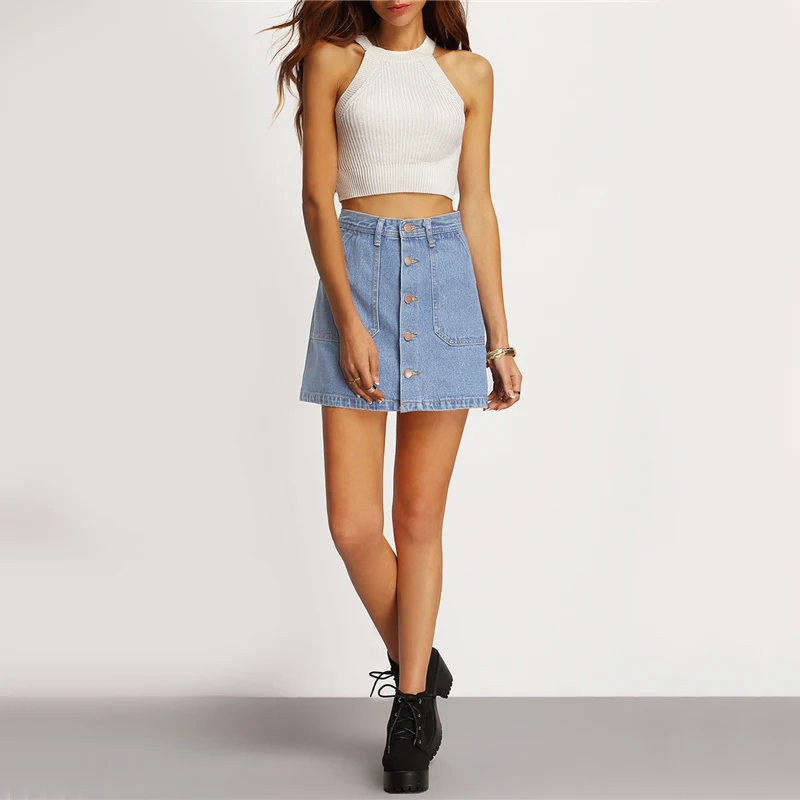 Короткая темно-синяя джинсовая юбка мини на пуговицах спереди с высокой талией