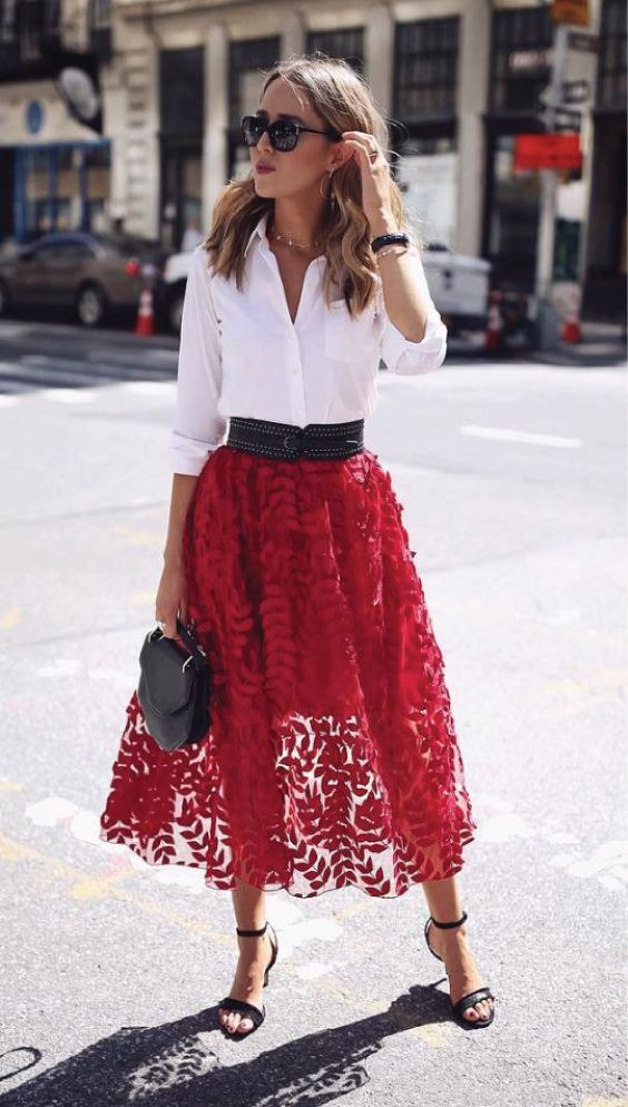 https://www.instagram.com/victoria_fox0001/Красная кружевная юбка + белая рубашкаКак бы ярко ни выглядела кружевная юбка, она все равно отлично подходит для создания солидных образов. Чтобы завершить ансамбль, стоит подобрать к юбке рубашку из плотного материала. Если наряд повседневной, тогда выбирайте рубашку из легких, полупрозрачных тканей. Такой тандем создает романтичный стиль модницы.
