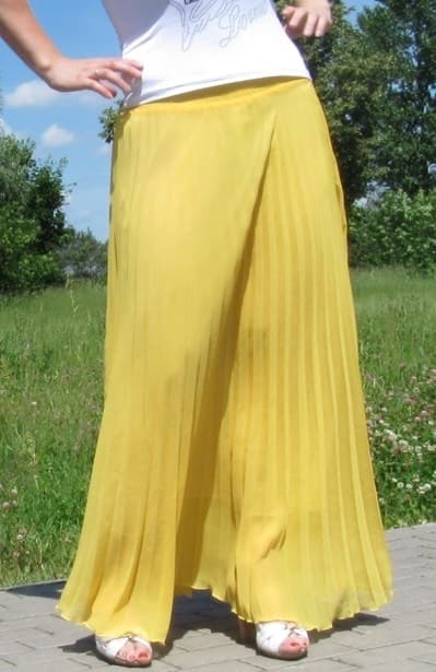 - Юбка со складками в пол, увеличивает талию и бедра на несколько сантиметров. Об этом следует помнить женщинам с пышными формами. Лучше всего выбирать в пользу юбки другого фасона, например, А-силуэта.