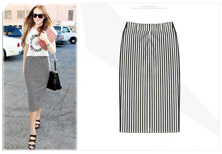 - юбка-карандаш с вертикальными чёрно-белыми полосками будет отлично сочетаться с коротким темным топом.